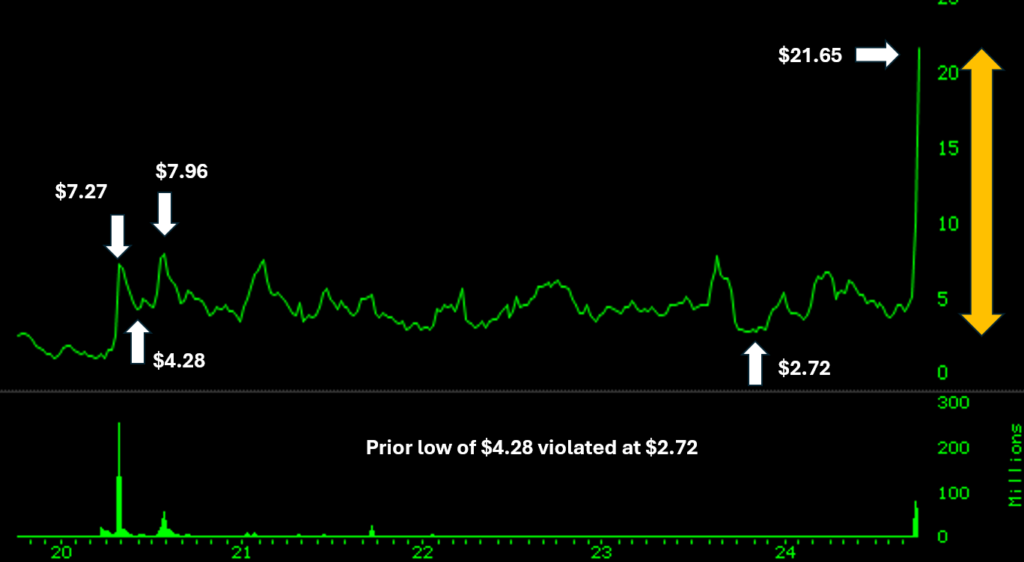 Well, this does not look as good. Then what to do? Suppose you entered slowly at the breakout, then what? Frankly, it should not surprise anyone if the stock gyrates between the wide price range of anywhere from $4 to $5 dollars a share on the low end to $21.65 on the upper band as of today. More time needs to be given to let it fix a better range before making any decisions.