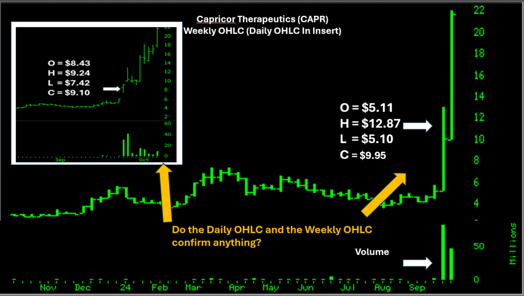 Sure, the breakout with a gap up was a good sign and an opening for you to test a position. But the big money is made on big commitments. Where can make or could you have made a big commitment? What can you observe in the charts for Capricor Therapeutics (CAPR) shown below.