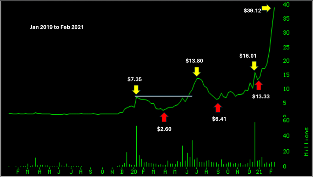 The uptrend, a series of higher highs and higher lows, becomes obvious. ImmunityBio (IBRX) wanted to begin its run from early 2020, even before the general market panic sell-off of March 2020. The tradeable move was from reassertion of the $7.35 high in the summer of 2020 to its high in February 2021. Though the price move was quite impressive, this being a biotechnology stock, a lot the success in capturing its move would have been challenging.