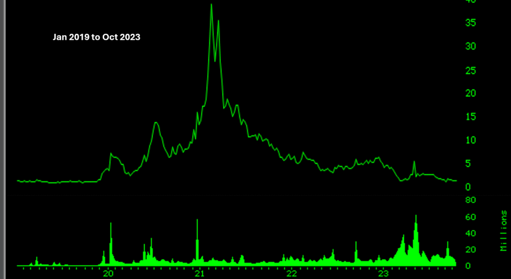 ImmunityBio (IBRX) stock tracked the bear market in total tandem and from its high of $39.12 in February 2021 fell to its low of $1.29 and $1.31 in September and October 2023. Most of the move, from around $26 to around $3 was tradeable for the short seller. Does that mean for the longs, should an upward swing begin in all seriousness, a sizable tradeable move will be available?