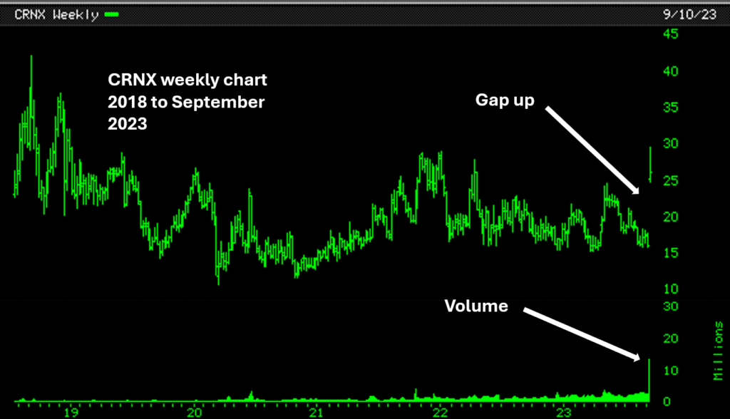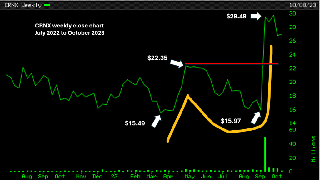 Just because Crinetics Pharmaceuticals (CRNX) jumped the gun before the overall market does not mean a thing. Stocks move at a different pace and with a different rhythm from one another. But the October 2023 move was good enough to make a speculator place the stock on his watchlist.