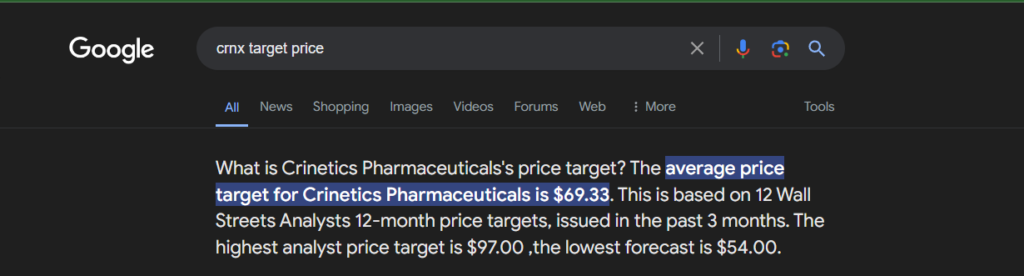 You can prove to yourself that the stock market is full of it. Well, that did not come out right. The stock market is full of predictions. Suppose you google “CRNX Target Price.” Lo and behold the first thing that pops up is as shown below.