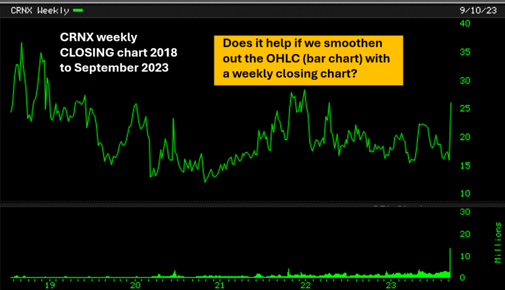 Let us look at the first few years of Crinetics Pharmaceuticals’ life and the CRNX stock chart. Just to see if anything stands out.