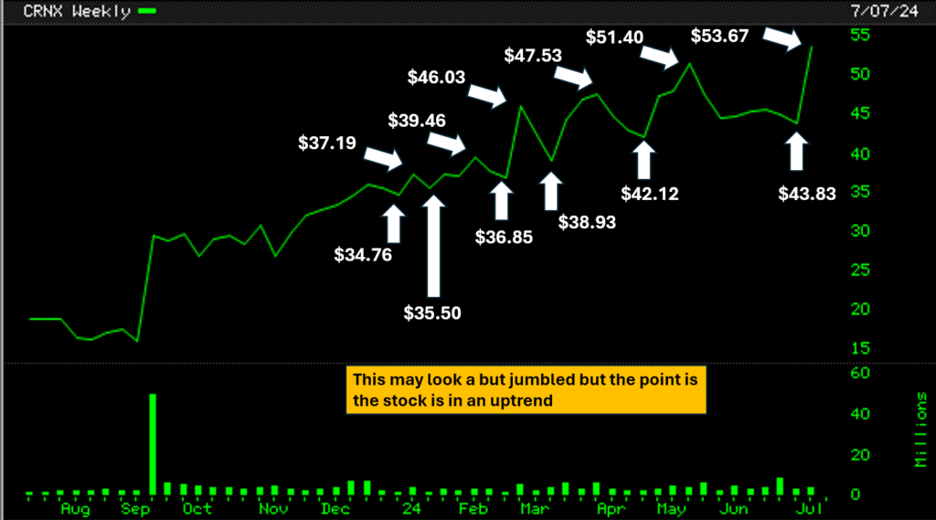 Now things seem a lot clearer. From the low pegged in March 2023 of $15.49, Crinetics Pharmaceuticals (CRNX) made a near-term high at $22.35. A reaction to the move from $15.49 to $22.35 ensues, which pegs a low of $15.97. Since the low at $15.97 is higher than the prior low at $15.49, you are now waiting for the stock to peg a higher high than the prior high of $22.35.