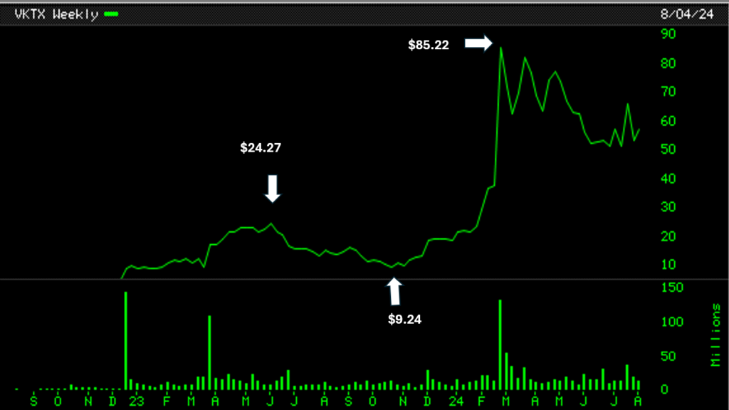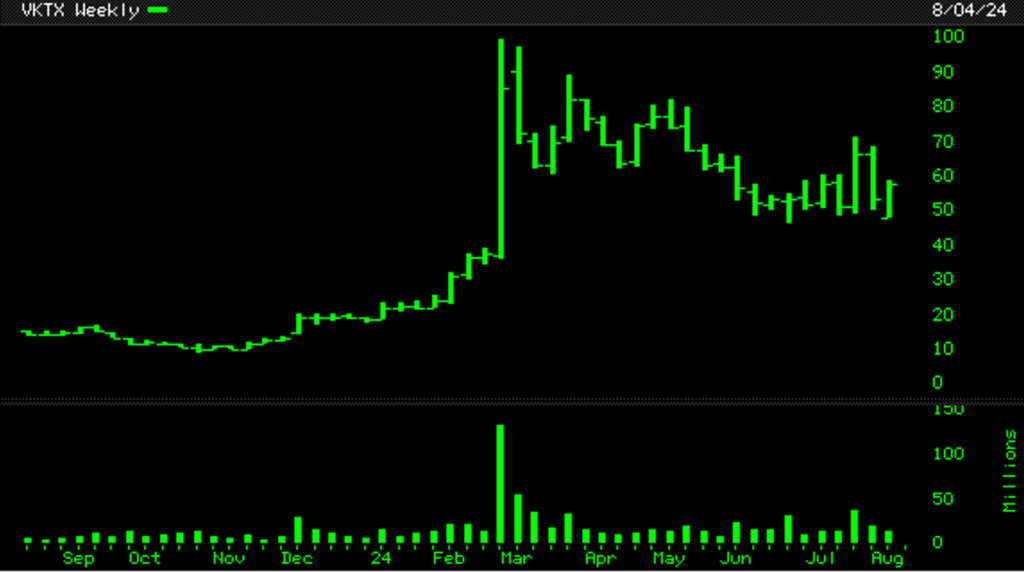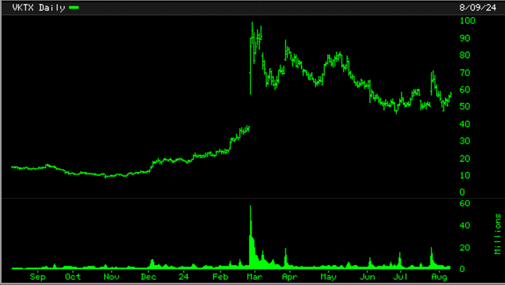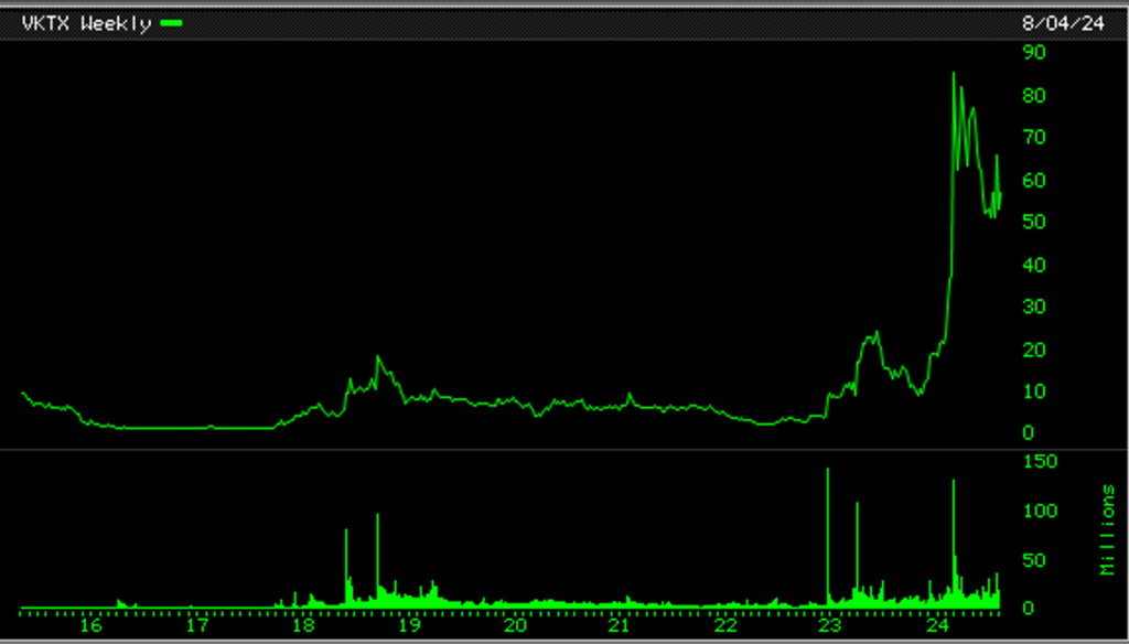Take a look at an all-time chart of Viking Therapeutics (VKTX). Is this a good stock or a bad stock?